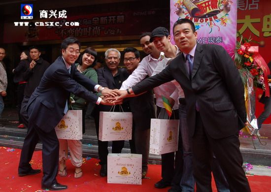 義烏是一個國際化的商貿城市,來自五大洲的五位朋友一起共同見證了銀泰百貨義烏伊美店的誕生;據了解,這些外籍顧客代表是通過媒體在線數百名報名應征者海選出來的。圖右1為銀泰百貨集團副總裁王崗,圖左1為銀泰百貨浙中區總經理王劍強,圖中為五位外籍顧客。