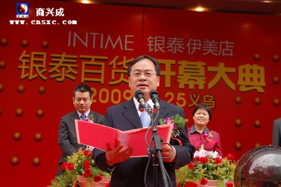 義烏市人大常委會主任童香娣、市政協主席楊林章、副市長吳森民等領導出席了開幕慶典。義烏市副市長吳森民高度肯定了銀泰百貨的進駐對提升義烏城市形象的重要意義,并提出義烏正努力通過完善商業規劃,吸引更多中高端商業進駐。義烏市有70萬常住人口,100萬外來人口。圖為副市長吳森民致辭。